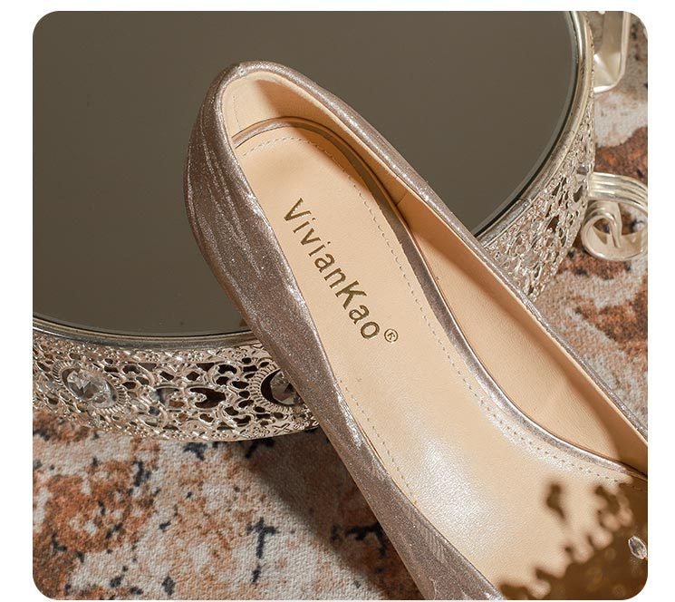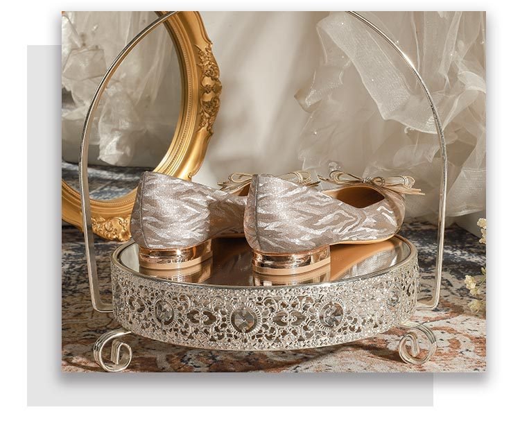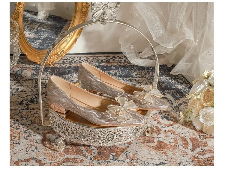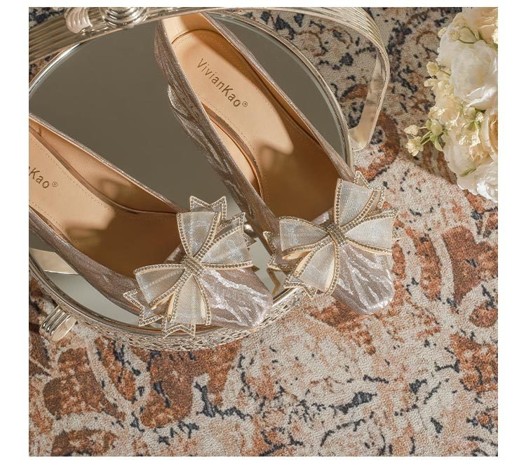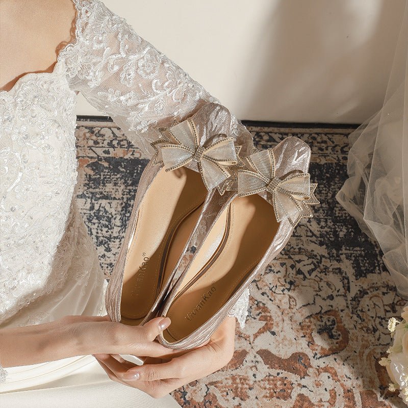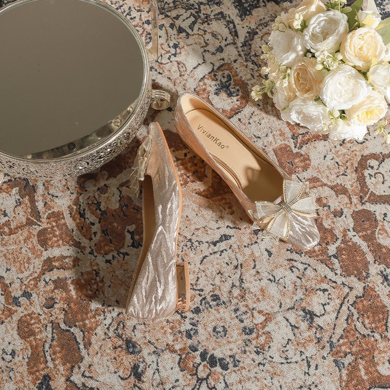 228-51 Champagne Thin and Glittering Bow Crystal Flat Wedding Shoes Female Square Toe Bridal Shoes