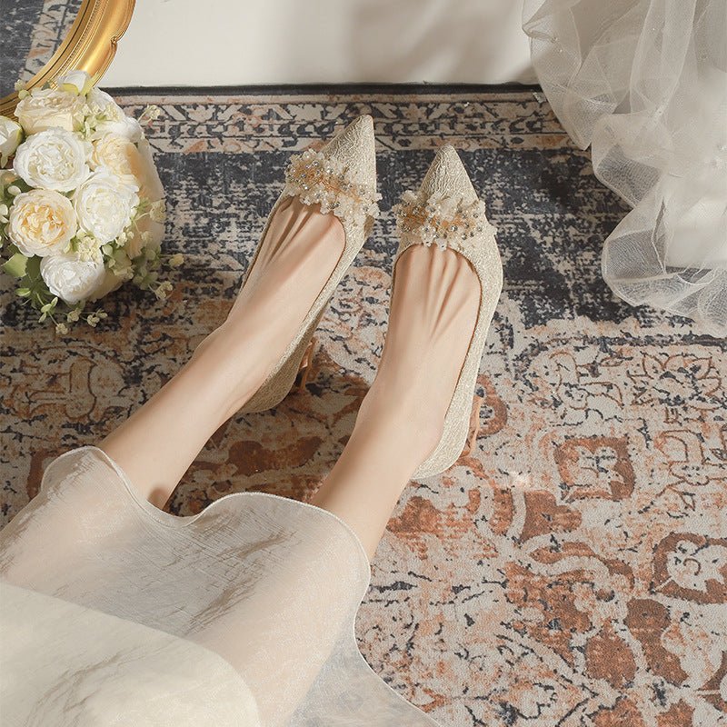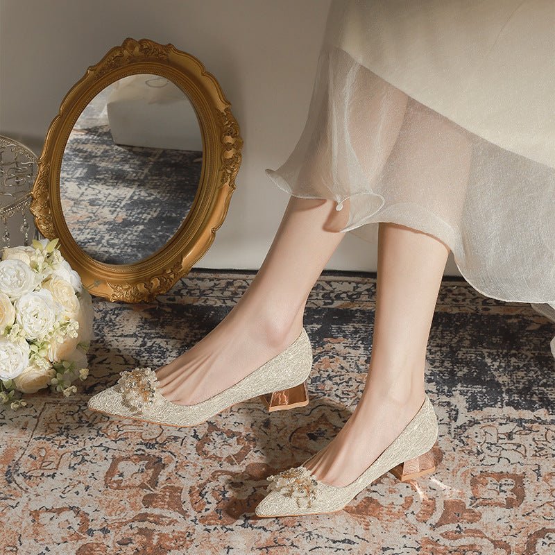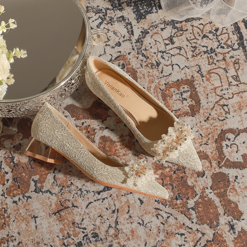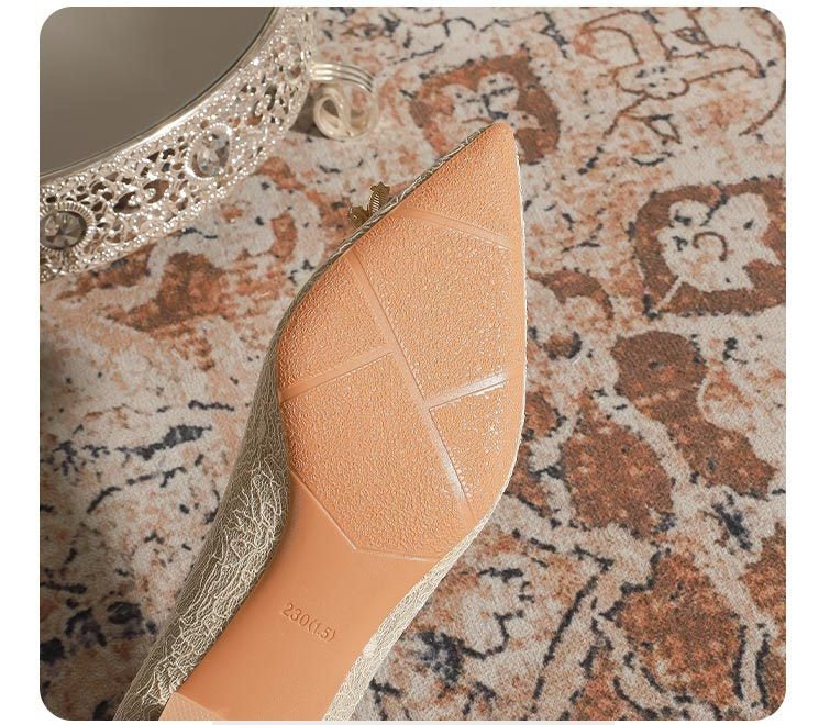 3118-7 French Lace Thick Heel Flat Wedding Shoes One-Word Flower Main Wedding Dress Banquet Two-Way Heel Shoes