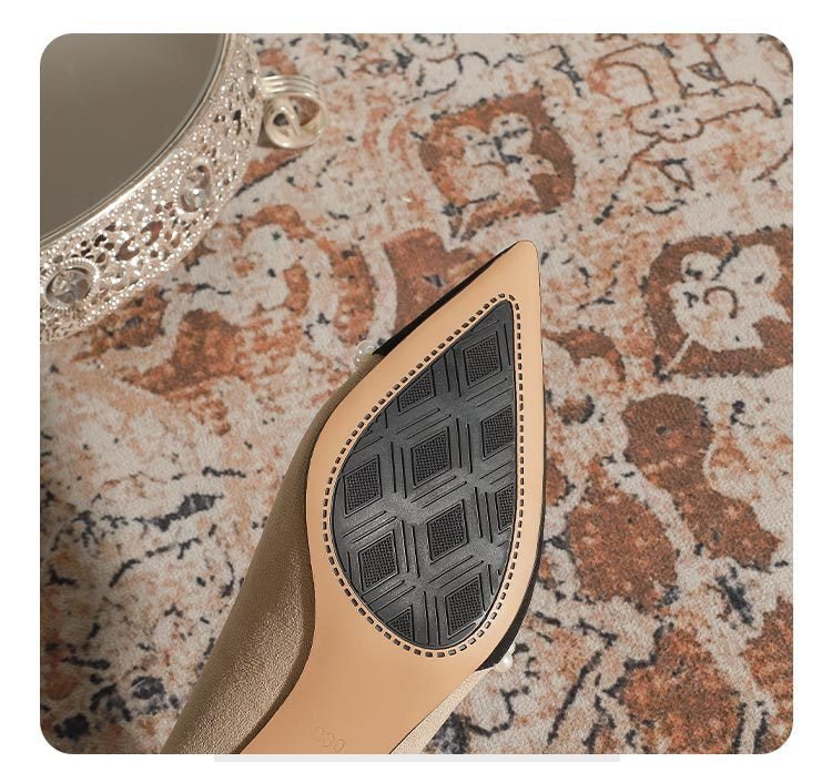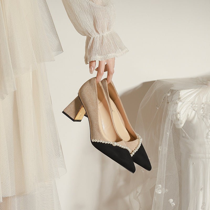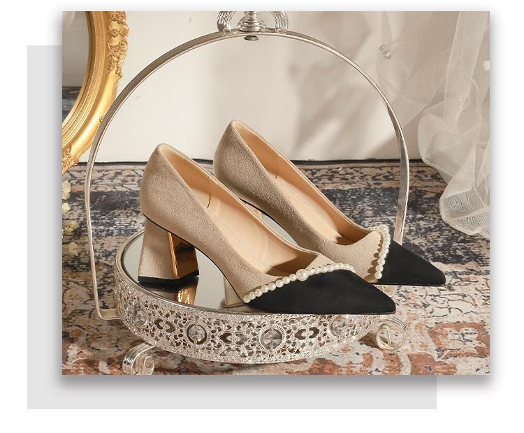 650-80 Color Matching French Retro Gentle Temperament Pointed Classic Style Chunky Heel High Heel Pearl Shoes