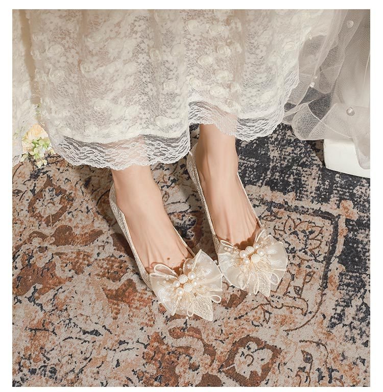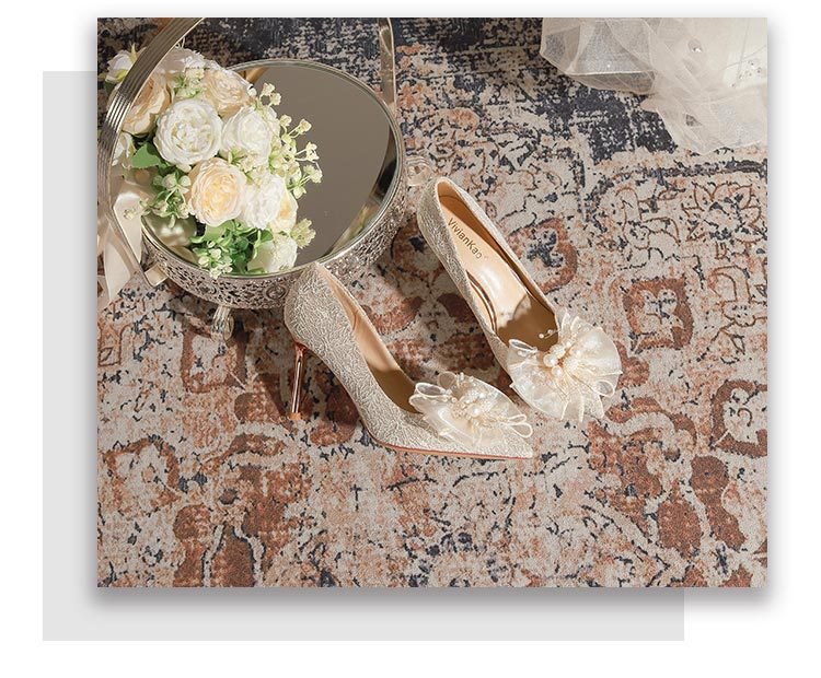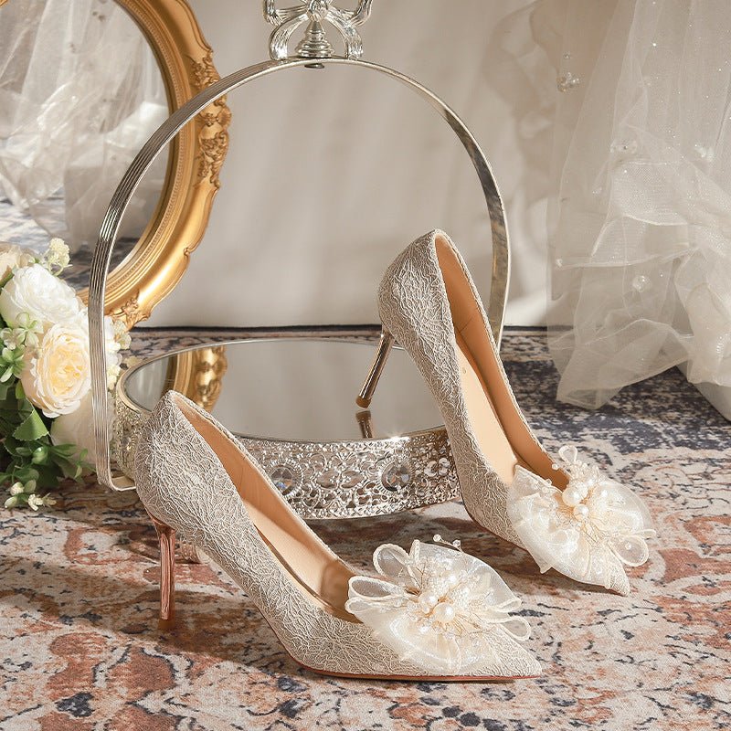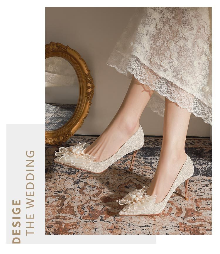 840-16 French Lace Pearl Wedding Shoes Bridal Shoes High Heels Princess Pointed Toe Temperament Fairy Stiletto Heel Pumps Women