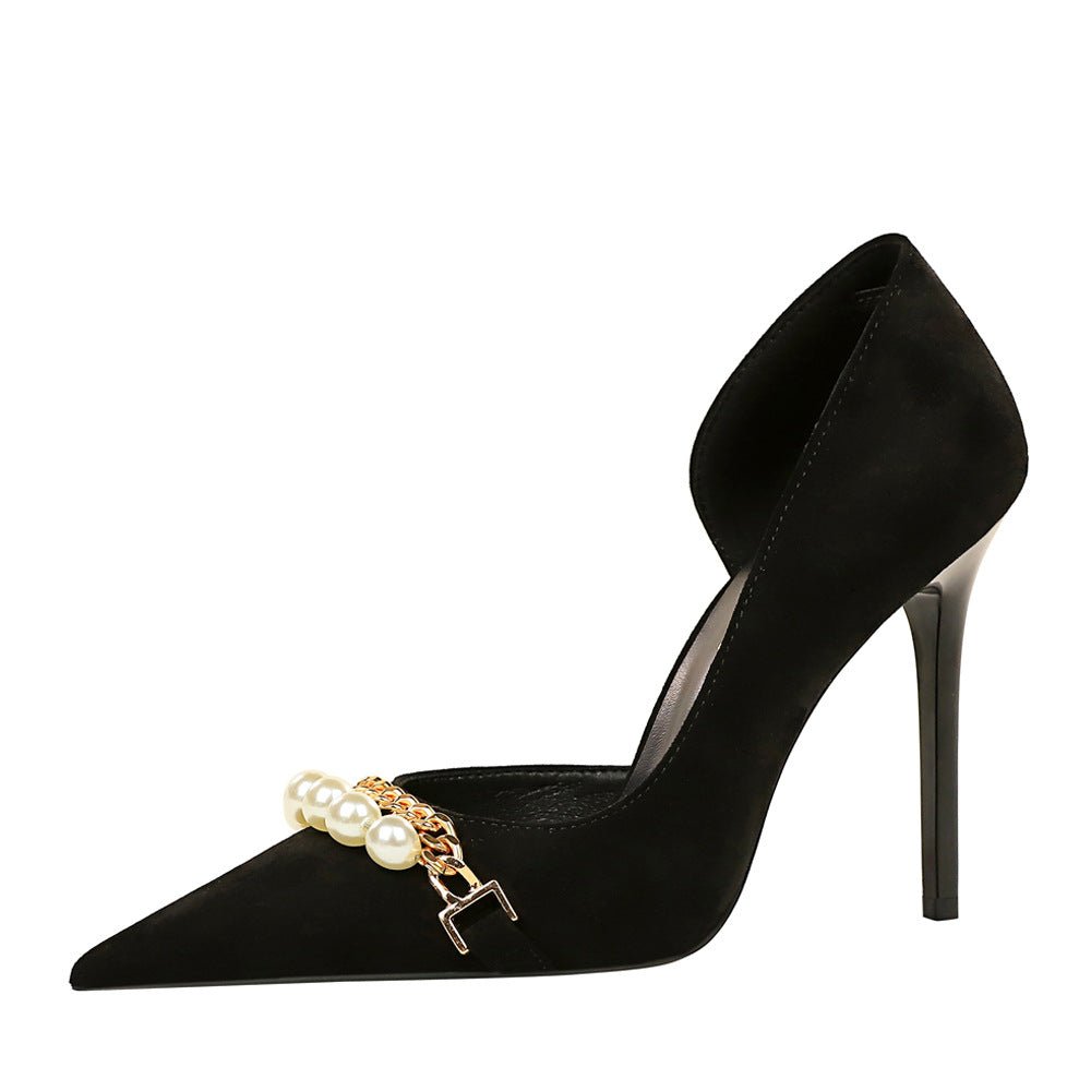 8829-2 European and American Style Banquet Slimming Super High Heel Suede Shallow Mouth Pointed Pearl Metal Chain Side Hollow Pumps