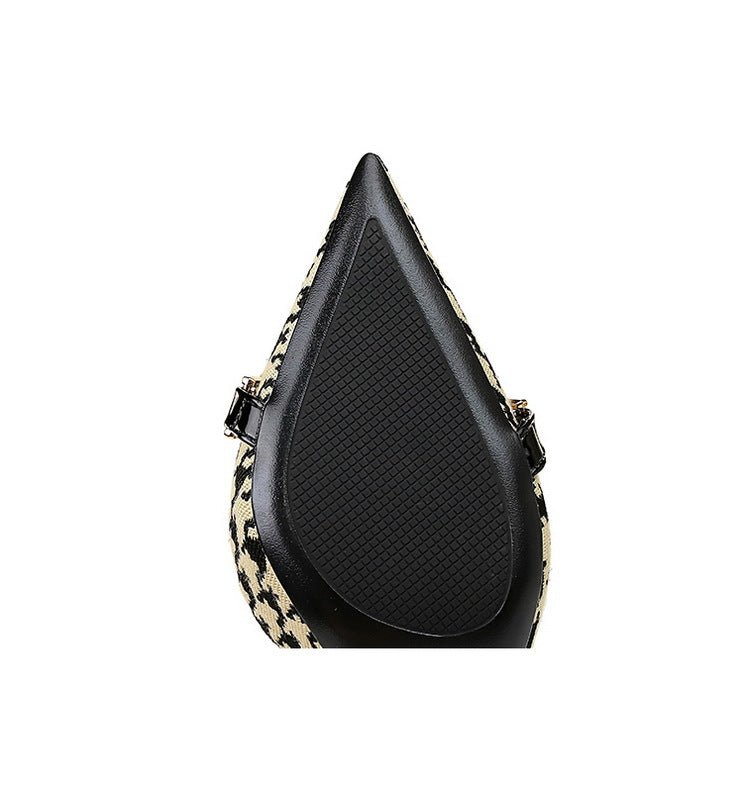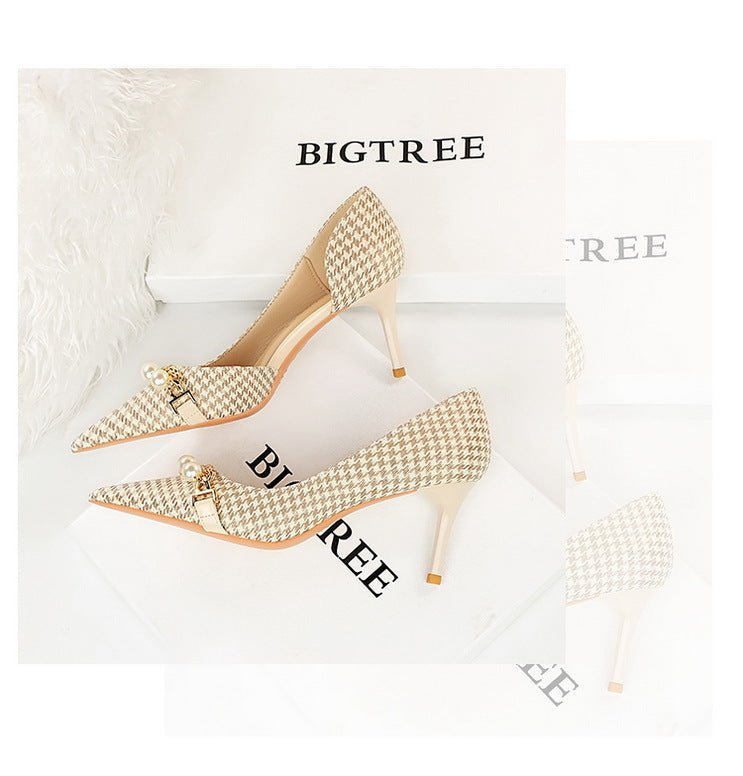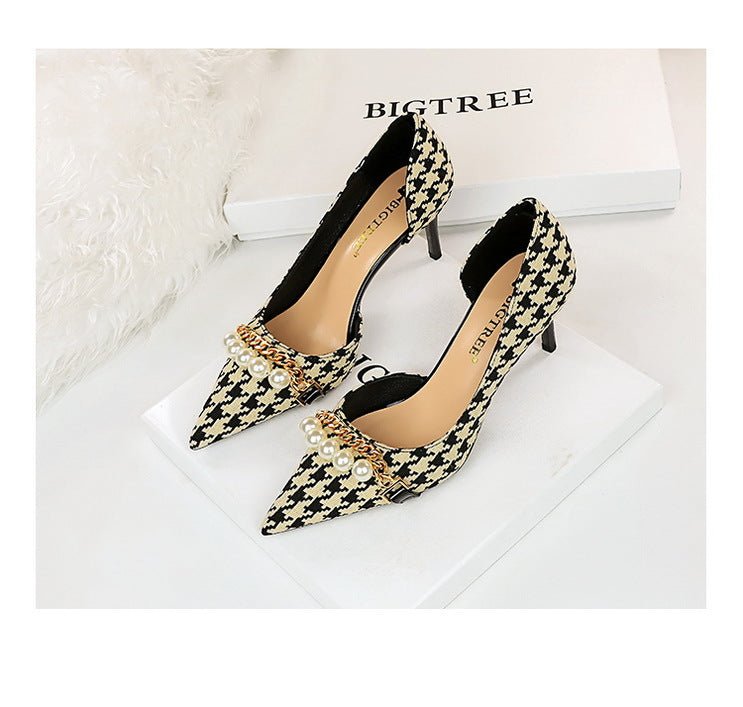8829-A1 Korean version of high-heeled shallow-mouth pointed side hollow cloth plaid pearl metal chain houndstooth shoes