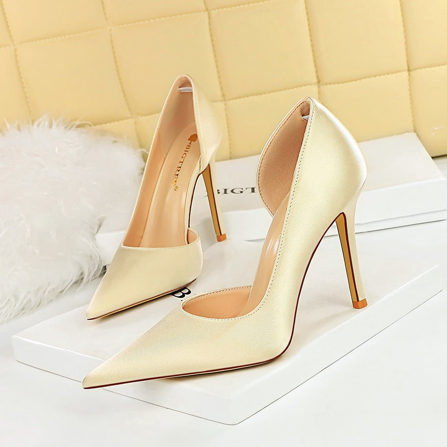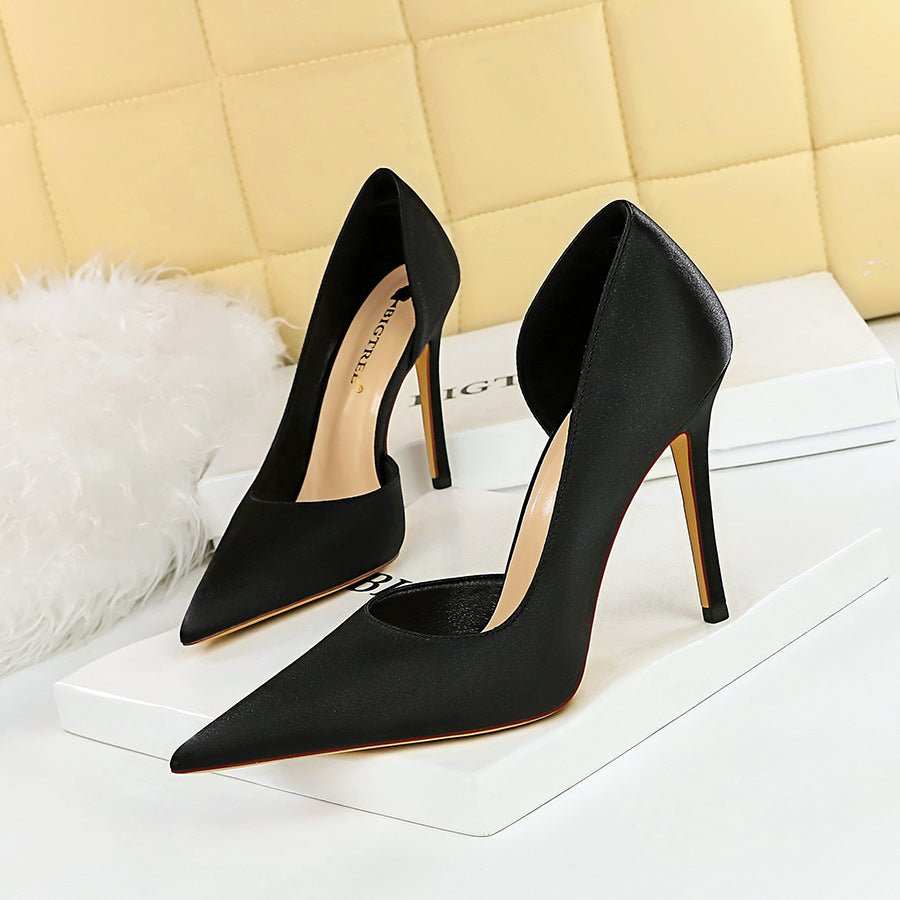 BIG TREE 3165-8 European and American Fashion Minimalist Super High Heel Stiletto Satin Shallow Mouth Pointed Side Hollow High Heels Women’s Thin Shoes