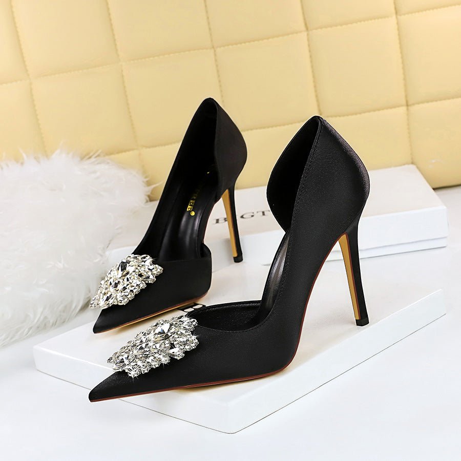 BIG TREE 3165-K11 European and American Banquet High Heel Shoes Side Hollow Stiletto Heel Shallow Mouth Pointed Toe Satin Rhinestone Women’s Shoes High Heel Pumps