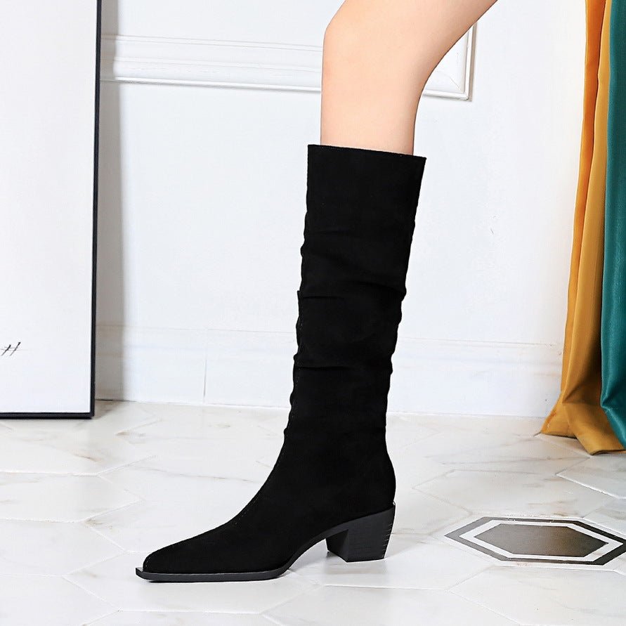 big tree shoes 009-17 Retro European American Style Knight Boots Winter Fashion Women’s Boots Mid Heel Chunky Heel Pointed Toe Suede Wrinkle High Leg Boot