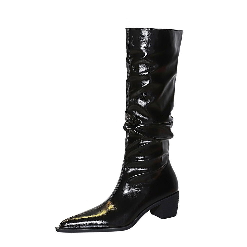 big tree shoes 009-18 Retro European American Style Women’s over-the-Knee Boots Chunky Heel Mid Heel Pointed Wrinkled Surface Glossy High Leg Boot Knight Boots