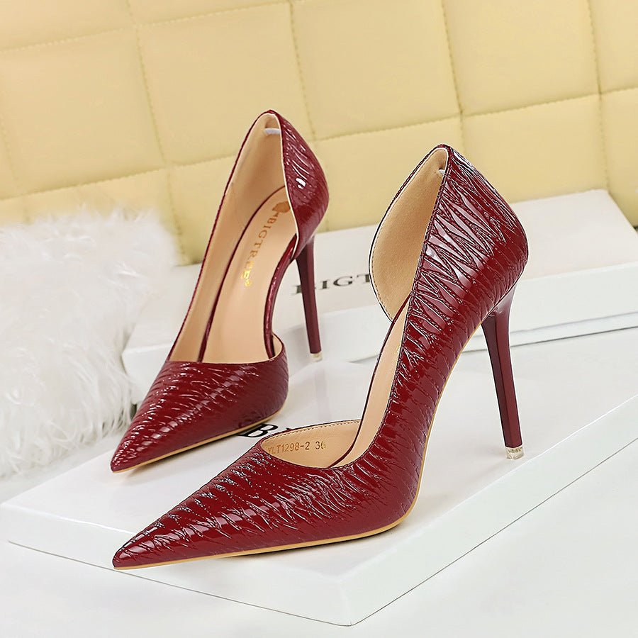 Popular Elements: European and American Style Fashion Sexy Nightclub Slimming Side Hollow Embossed Patent Leather Retro Banquet High Heels