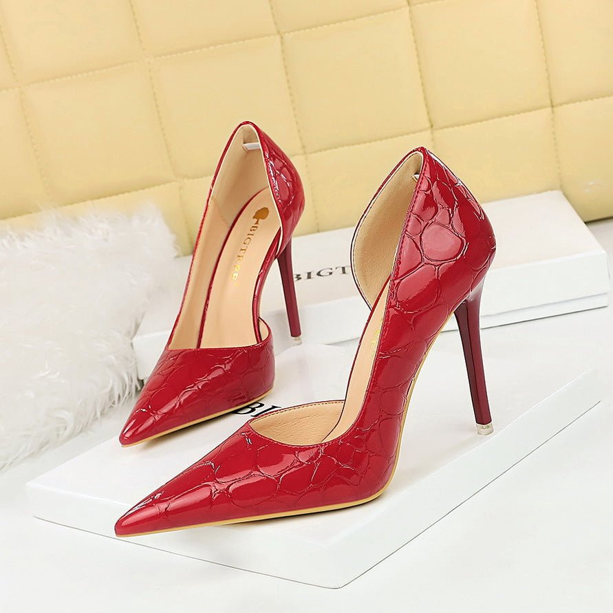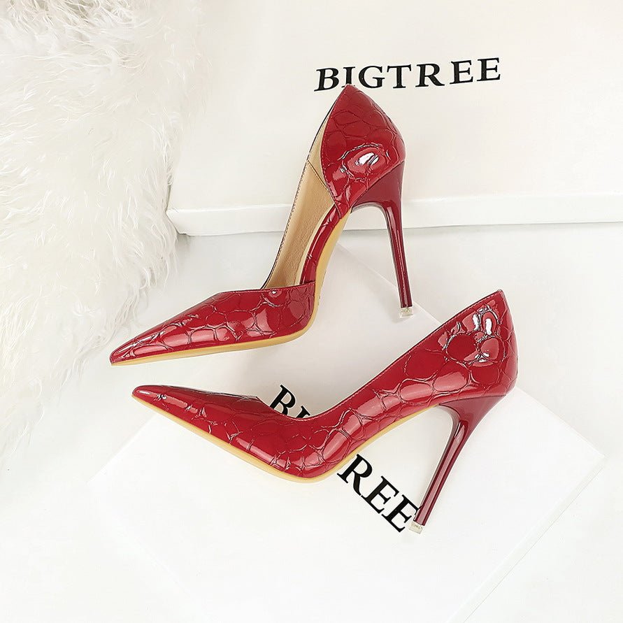 BIG TREE SHOES 1298-3 European and American Style Stiletto Heel Shallow Mouth Pointed Side Hollow Patent Leather Vintage Stone Pattern Side Hollow Pumps Women