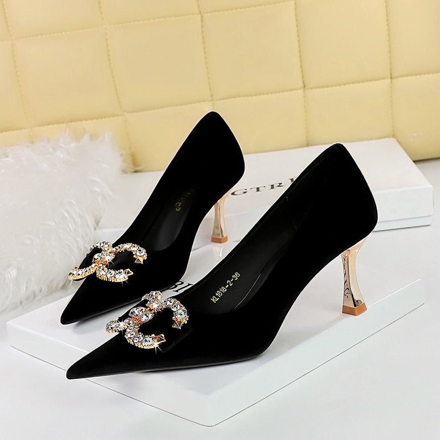 Popular Elements: European and American Style Fashion Banquet High Heels Light Luxury Elegant Western Velvet Metal Rhinestone Buckle Bow