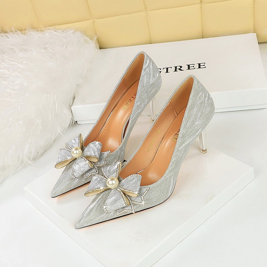 BIG TREE SHOES 1829-AH15 European and American Style Fashion Banquet Women’s Shoes High Heels Stiletto Heel Bow Rhinestone Flower Shoes
