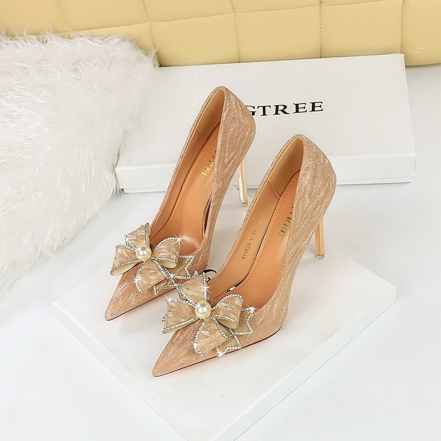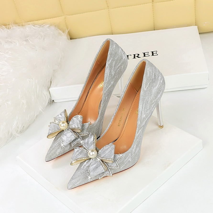 BIG TREE SHOES 1829-H15 European and American Style Banquet High Heels Stiletto Heel Shallow Mouth Pointed Pearl Rhinestone Bow Pumps