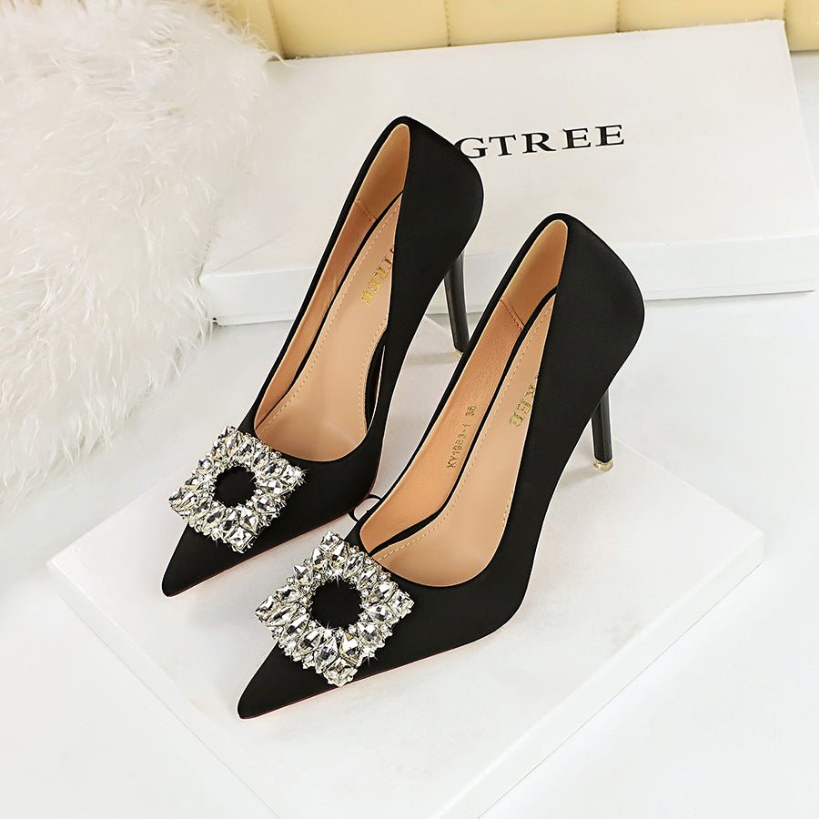 Big Tree Shoes 1983-K1 European and American Style Spring and Autumn Banquet High Heels Women’s Shoes Super High Heel Shallow Mouth Pointed Toe Satin Rhinestone Buckle Pumps