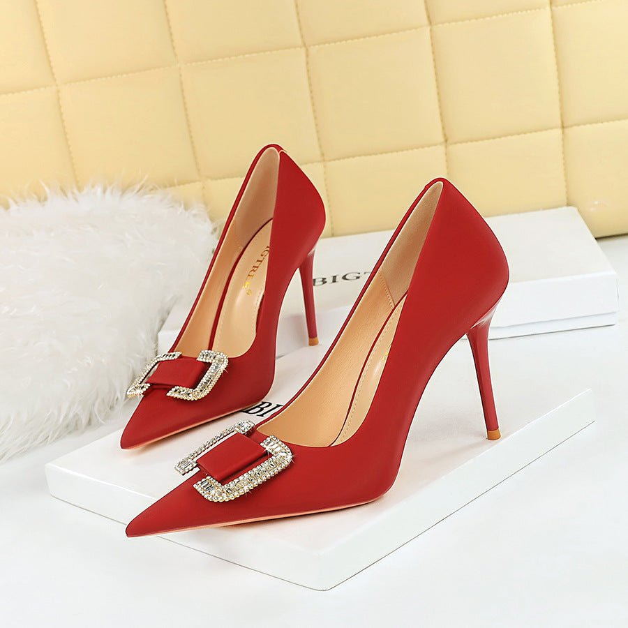 BIG TREE Shoes 3265-k6 European and American Style Fashion Banquet High Heels Stiletto Heel Shallow Mouth Pointed Toe Satin Metal Rhinestone Buckle Pumps Women