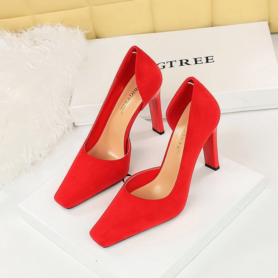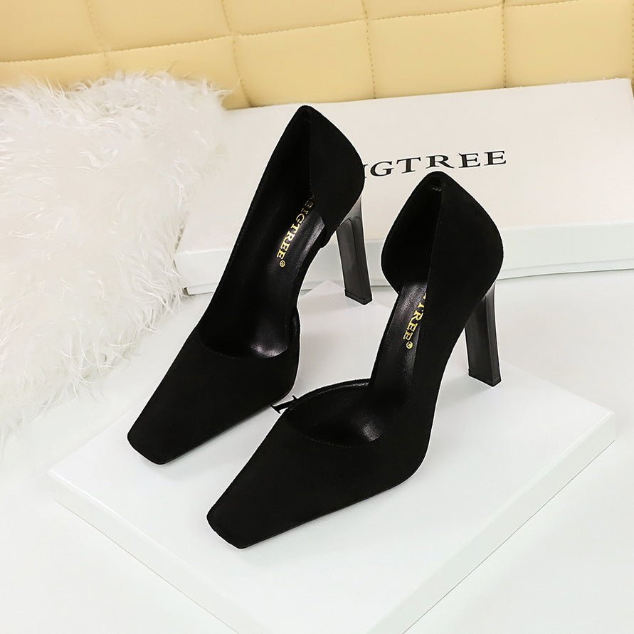 BIG TREE SHOES 3275-2 European and American Fashion Minimalist Thick Heel Super High Heel Low-Cut Square Toe Suede Side Hollow Pumps Women’s Shoes High Heels