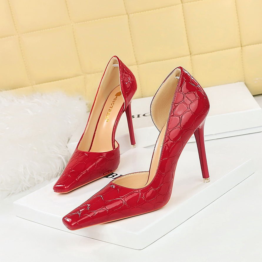 Popular Elements: European and American Style Fashion Retro Patent Leather Stone Pattern Side Hollow Square Toe Side Empty Shoes High Heels Super High Heels