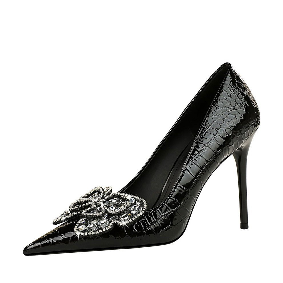 BIG TREE SHOES 3391-H23 Retro European American Style Banquet High Heels Patent Leather Stilettos Shallow Mouth Pointed Toe Rhinestone Bow Pumps Women