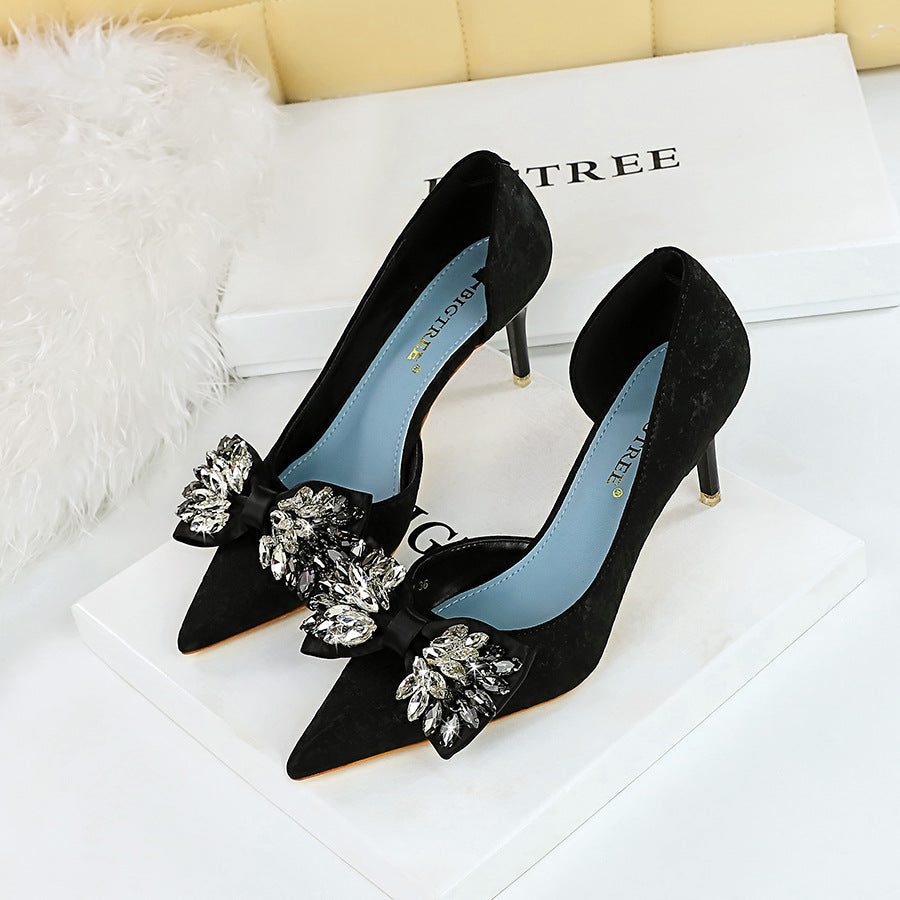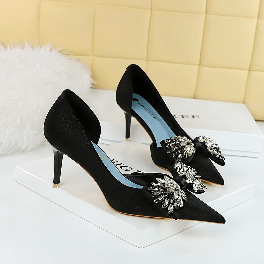 BIG TREE Shoes 6168-AH3 European and American Banquet Thinner Side Hollowed Women’s Shoes Shallow Mouth Pointed Toe Rhinestone Bow High Heel Pumps