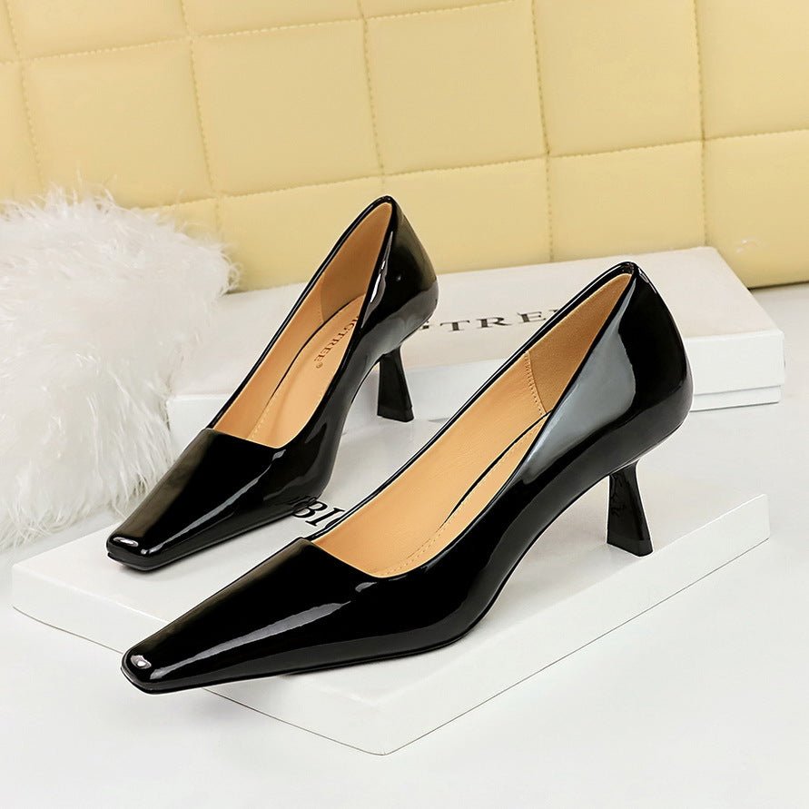 Popular Elements: Korean Style Fashionable Simple Spring and Autumn New Patent Leather Square Toe Versatile Business Ol Women’s Shoes High Heels