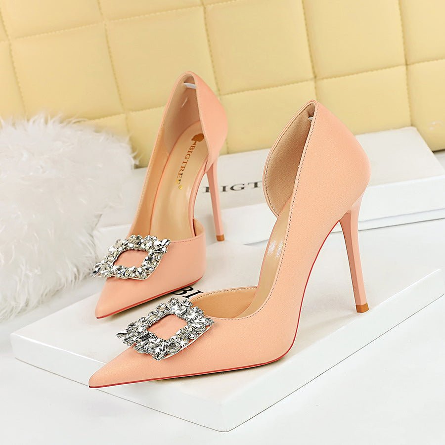 BIG TREE Shoes 626-K5 European and American Style Banquet Women’s Shoes High Heels Stiletto Low-Cut Pointed Side Hollow-out Rhinestone Buckle Super High Heel Shoes