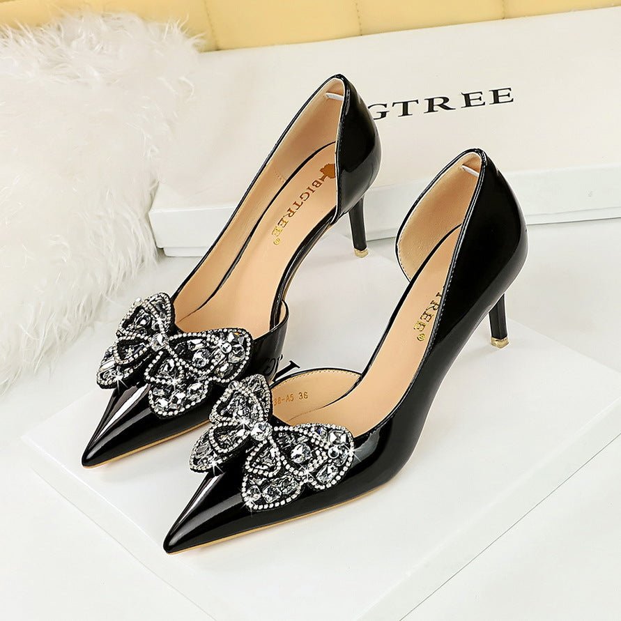 BIG TREE SHOES 638-Ah23 European and American Style Banquet High Heels Stiletto Heel Shallow Mouth Pointed Patent Leather Side Hollow Rhinestone Bow Pumps