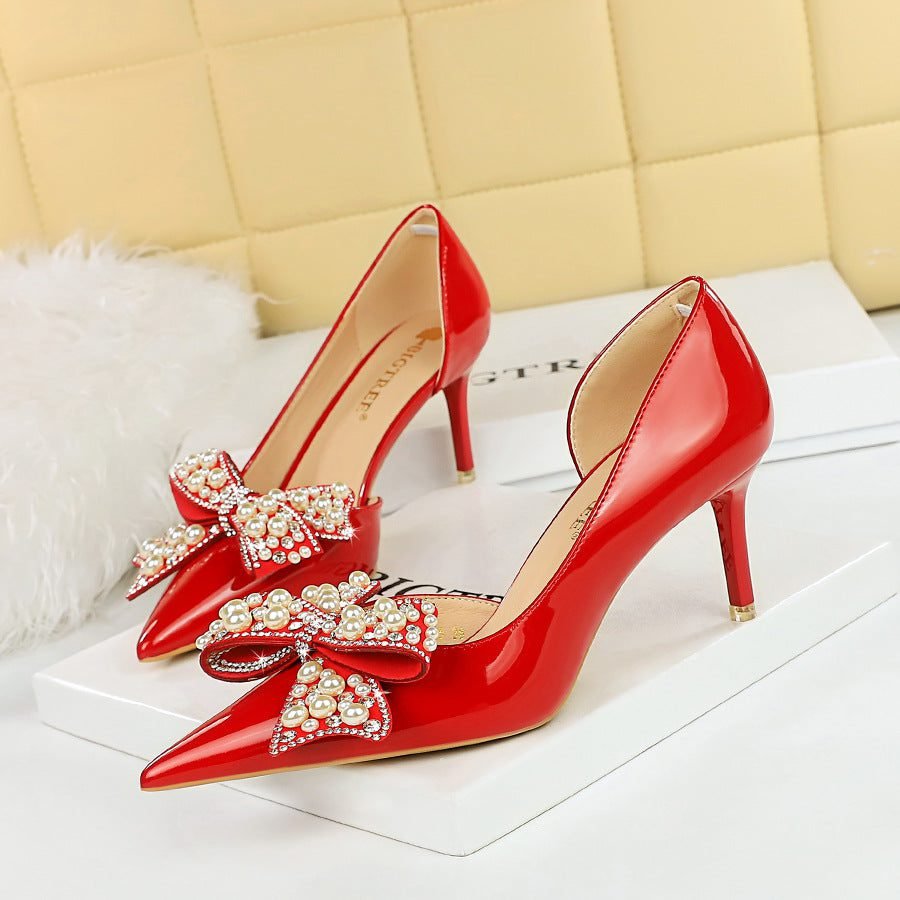 Big Tree Shoes 638-AH6 European and American Banquet Women’s Shoes High Heel Stiletto Shallow Mouth Pointed Pearl Rhinestone Bow Pumps High Heels