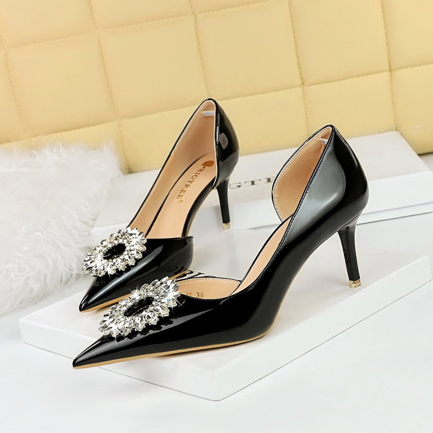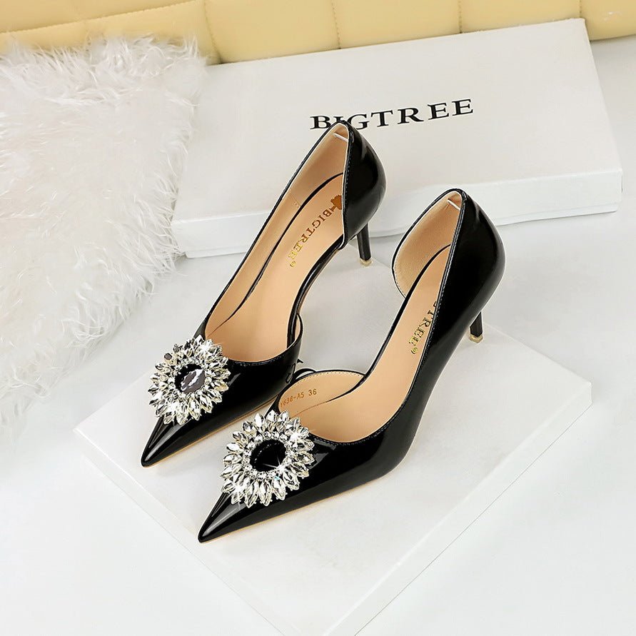 BIG TREE SHOES 638-Ak29 European and American Style Banquet Women’s Shoes High Heel Stiletto Low Mouth Pointed Patent Leather Side Hollow out Rhinestone Buckle Pumps Women