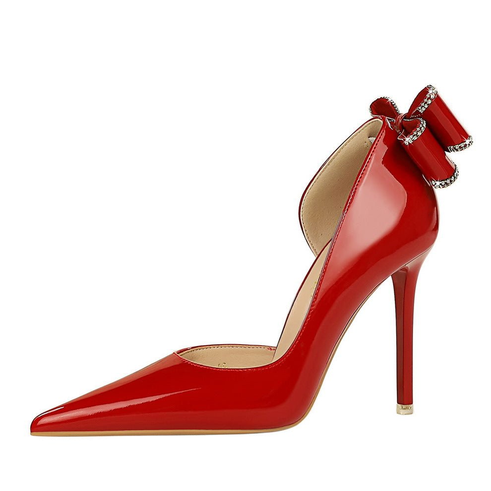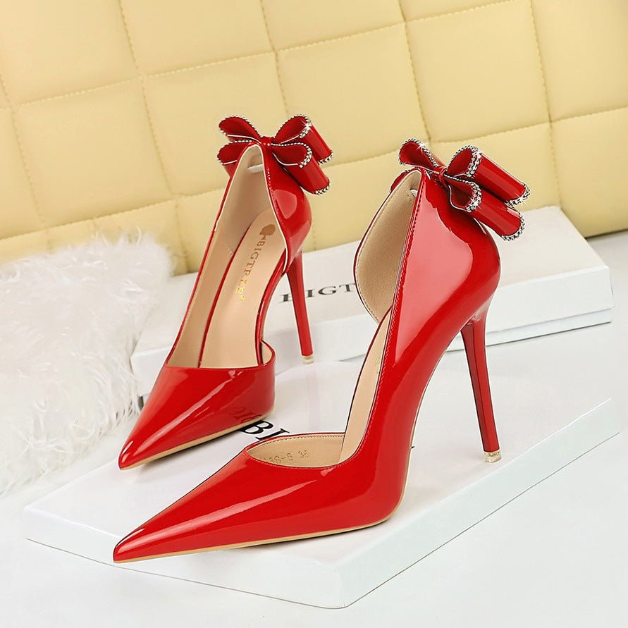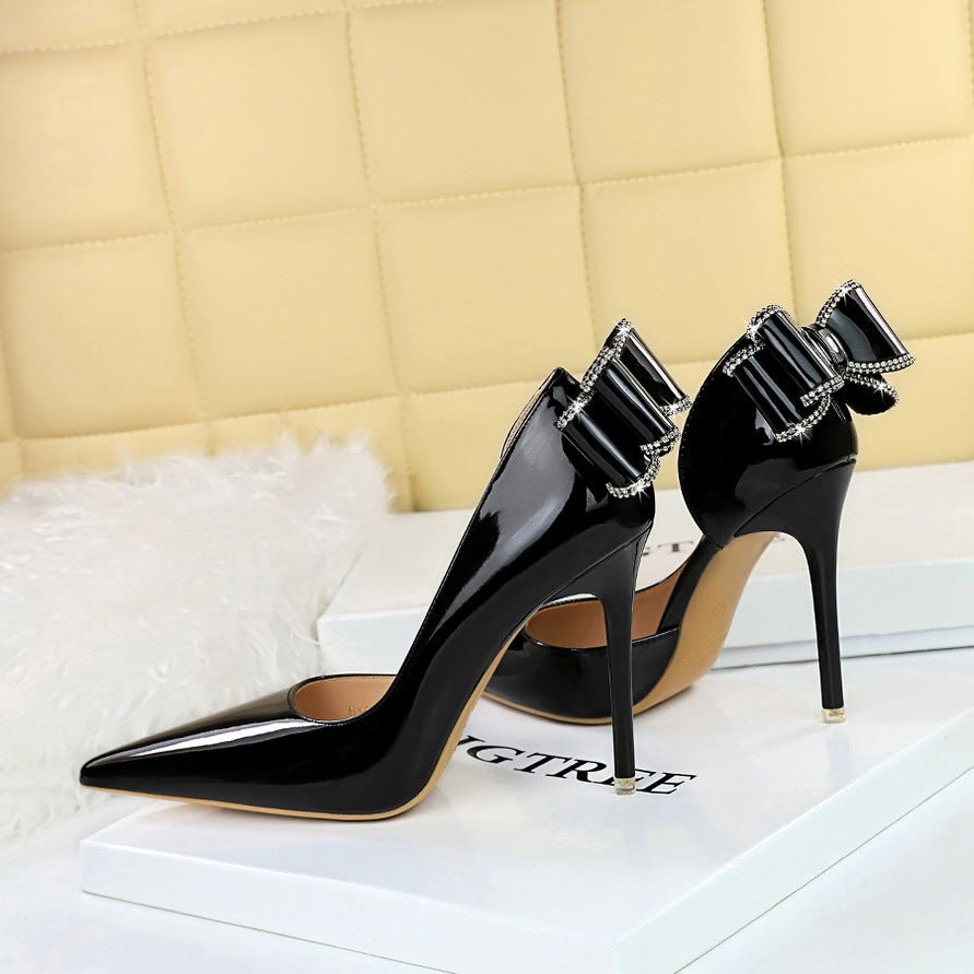 BIG TREE SHOES 638-H35m European and American Banquet High Heels Patent Leather Stilettos Shallow Mouth Pointed Toe Side Hollow Back Rhinestone Bow Pumps