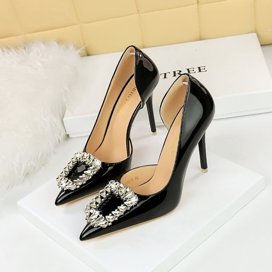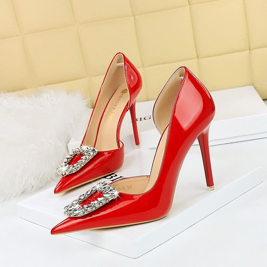 Popular Elements: European and American Style Light Luxury Banquet Side Hollow Side Empty Shoes Hollow out Shoes Patent Leather Rhinestone Buckle High Heels Wedding Shoes