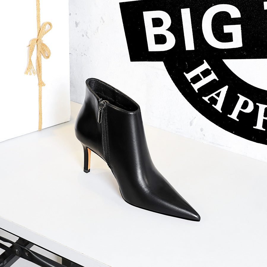 BIG TREE SHOES 7286-1 European and American Style Fashionable Simple Winter Side Zipper High Heel Pointed Toe Pedicure Slimming Ankle Boots