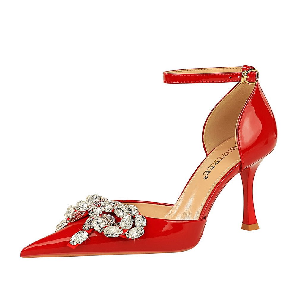 BIG TREE SHOES 8323-h19 Korean Style Banquet Women’s Shoes Patent Leather High Heel Low-Cut Pointed-Toe Hollowed Rhinestone Bow Strap Sandals