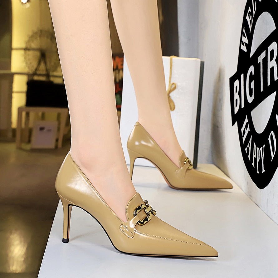 Popular Elements: Retro European and American Style Fashionable Slimming Versatile High-Cut Shoes High Heels Deep Mouth Metal Buckle Belt Buckle
