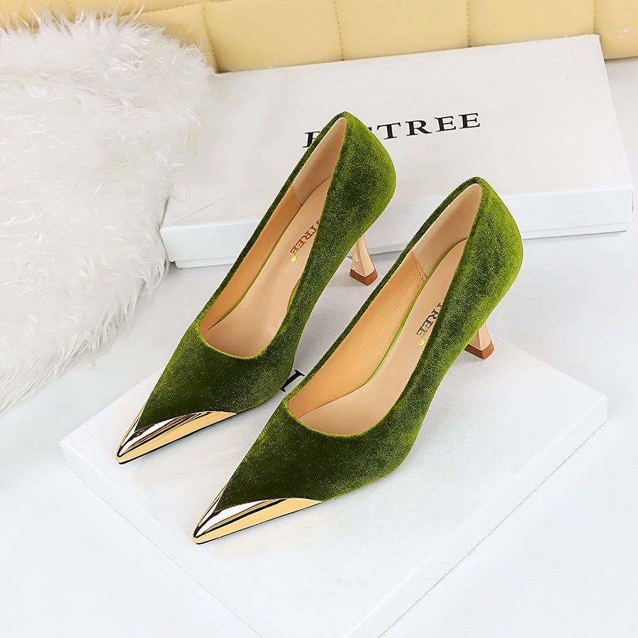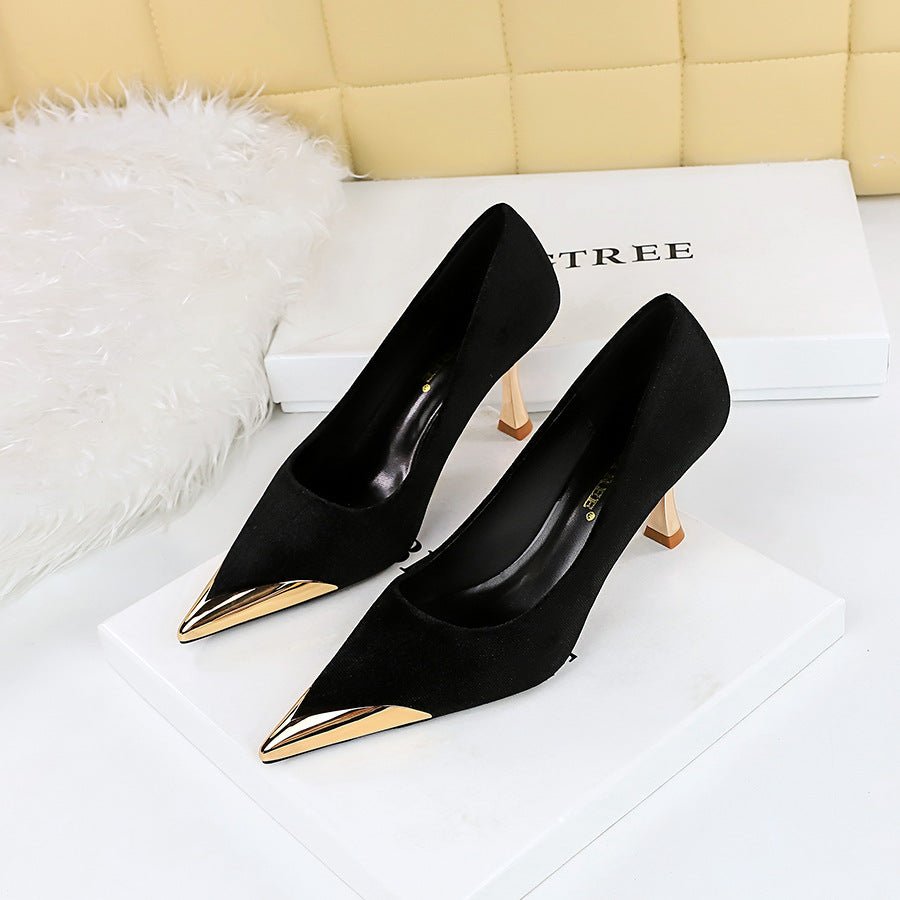BIGTREE 1818-1 European and American Fashion Sexy Nightclubs Thinner Wine Glass Heel High Heel Suede Shallow Mouth Metal Pointed-Toe Women’s Shoes