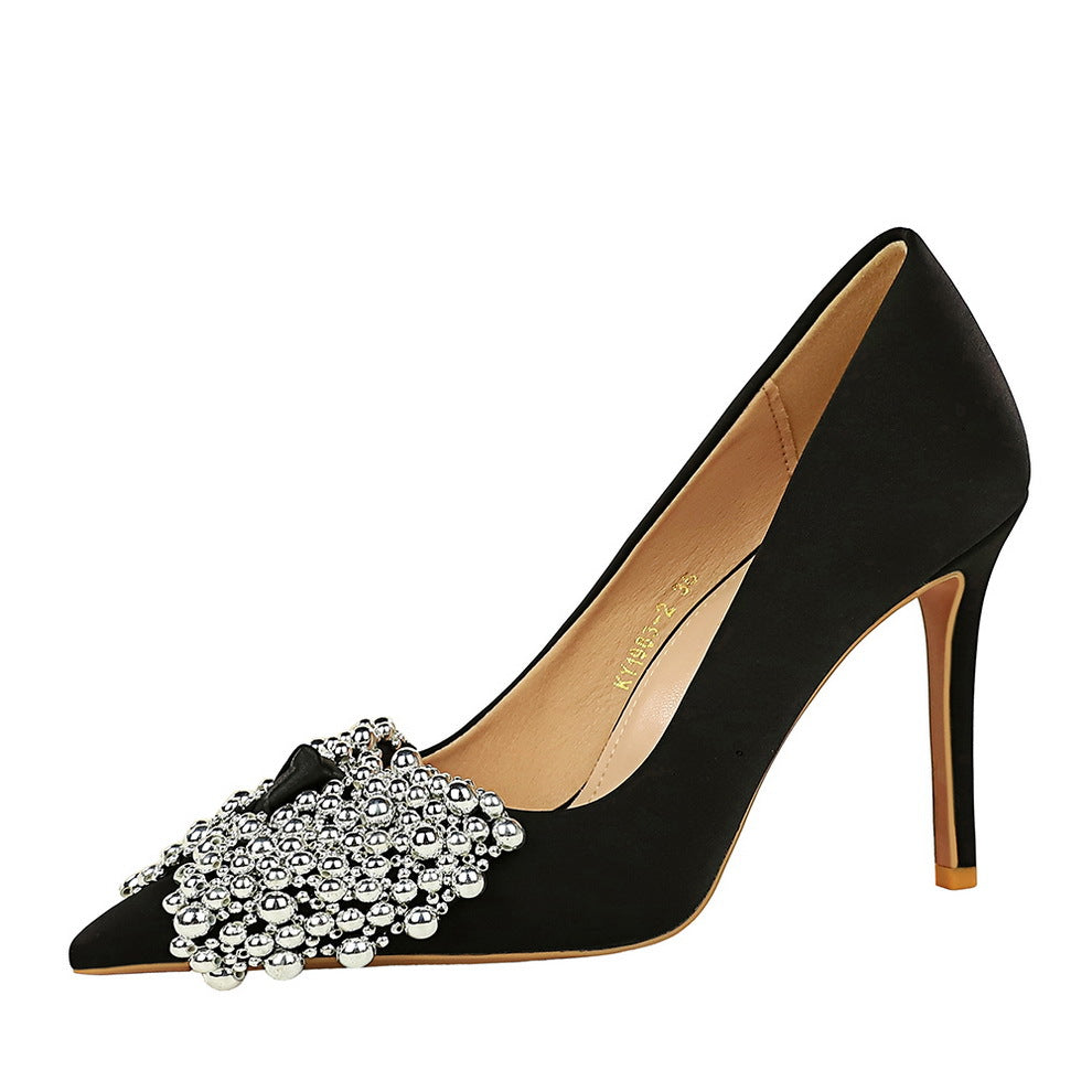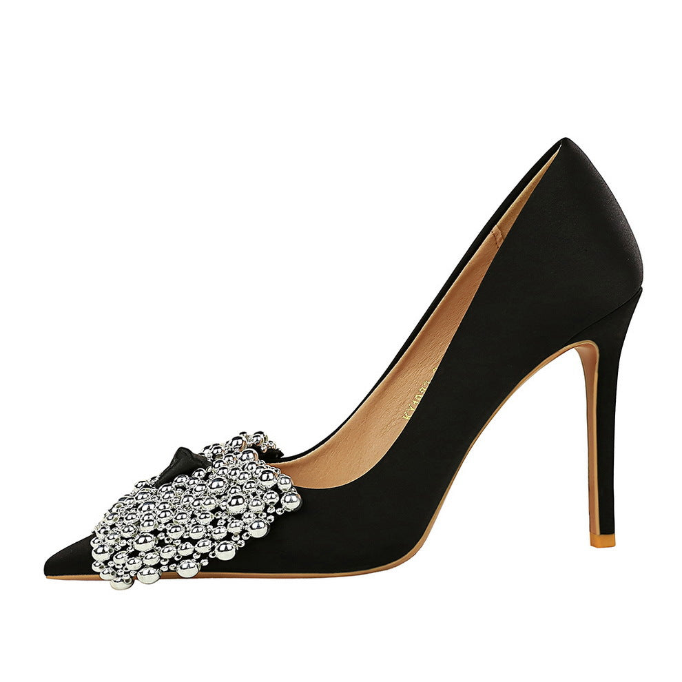 Popular elements: Korean version, satin, stiletto, super high heel, shallow mouth, pointed head, high heels, single shoes, bow