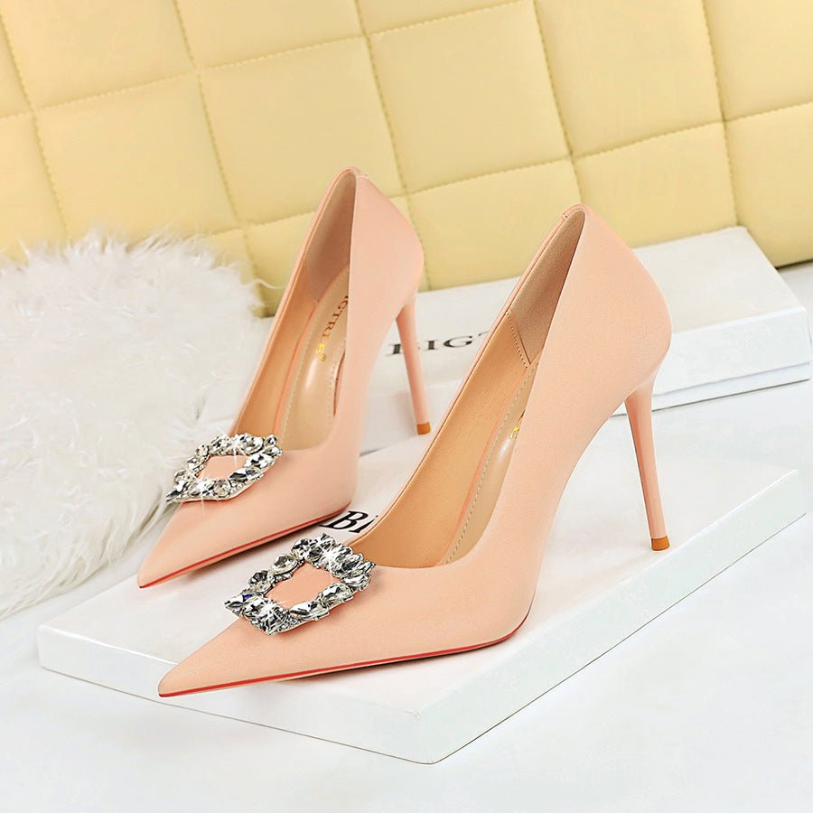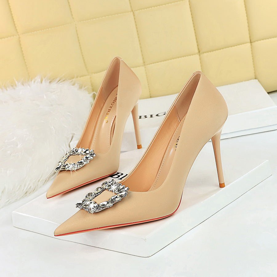 BIGTREE 3265-K2 Korean Style Stylish Women’s Shoes Super High Stiletto Heel Shallow Mouth Pointed-Toe Metal Rhinestone Buckle Pumps Women’s High Heels