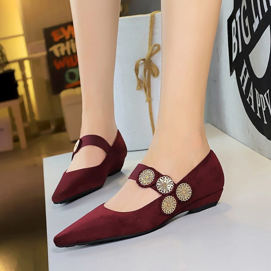 BIGTREE 3683-1K92 retro style versatile wedge heel suede low heel metal decoration one word with shallow mouth pointed women’s single shoes