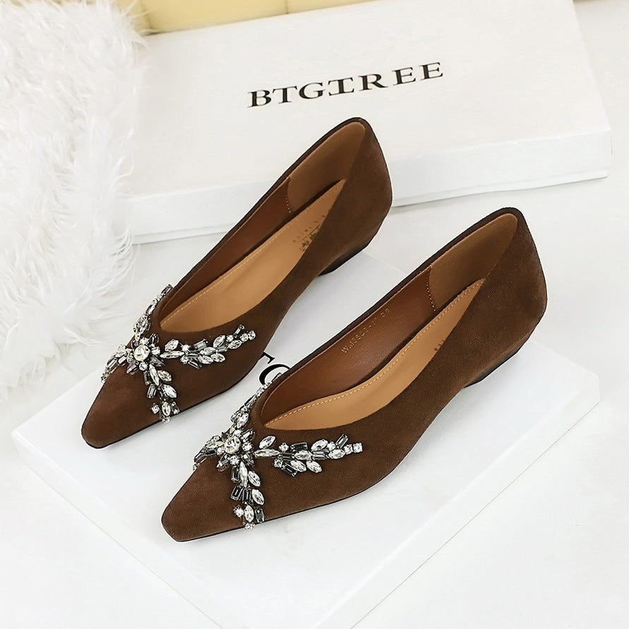 BIGTREE 3683-H69 Korean version of temperament women’s shoes pointed head shallow mouth suede single shoes rhinestone chain slope heel low heel versatile women’s single shoes