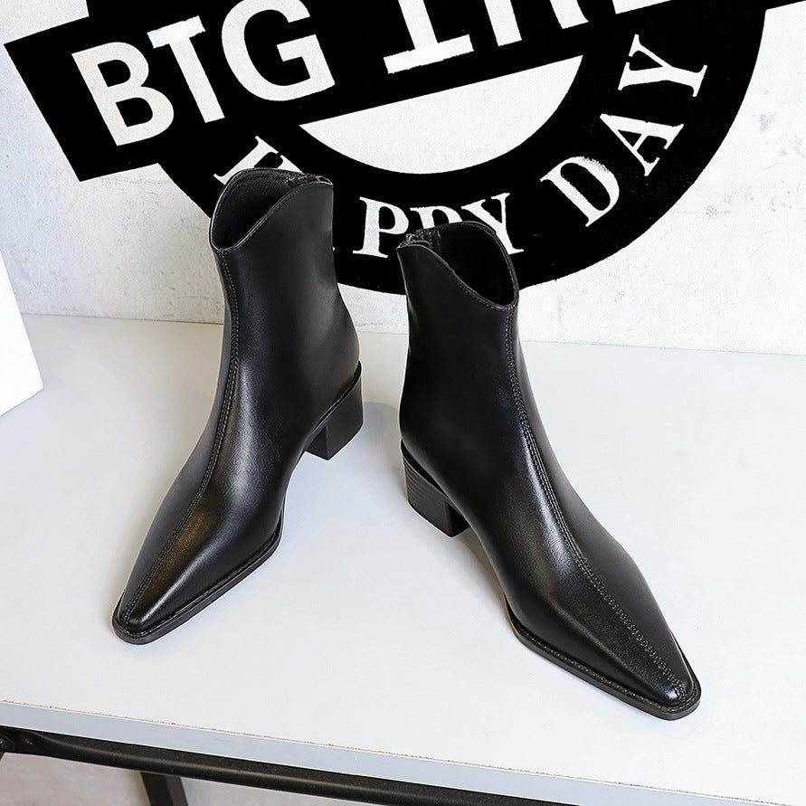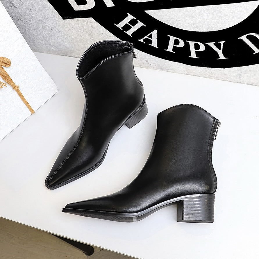 BIGTREE 578-2 European and American style retro simple thick heel medium heel versatile women’s boots short boots pointed rear zipper winter short boots
