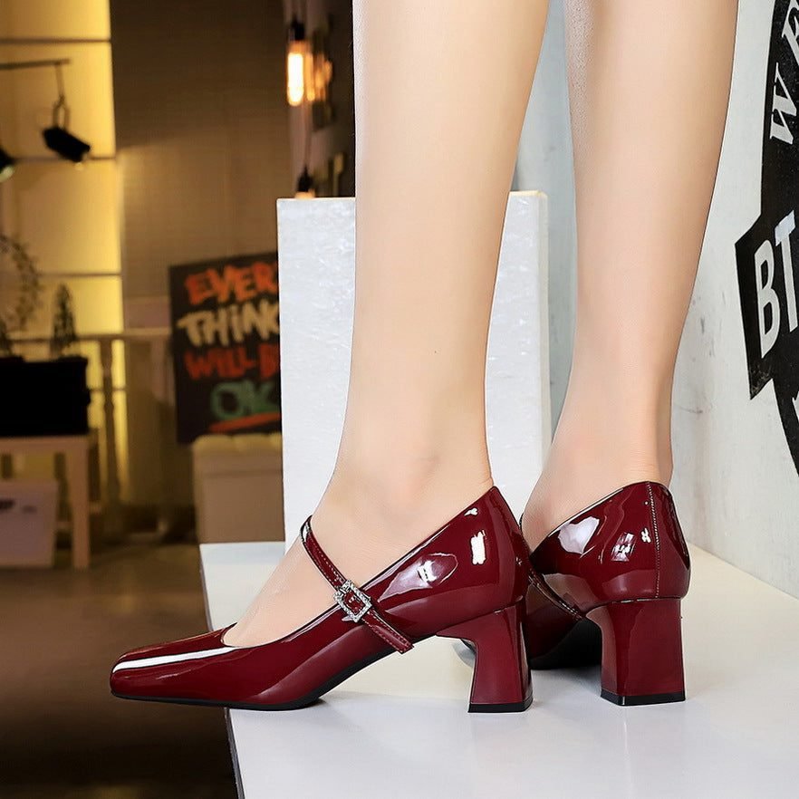 Popular elements: European and American style, rhinestone one-word belt, square head, medium heel, thick heel, single shoes, patent leather women’s shoes