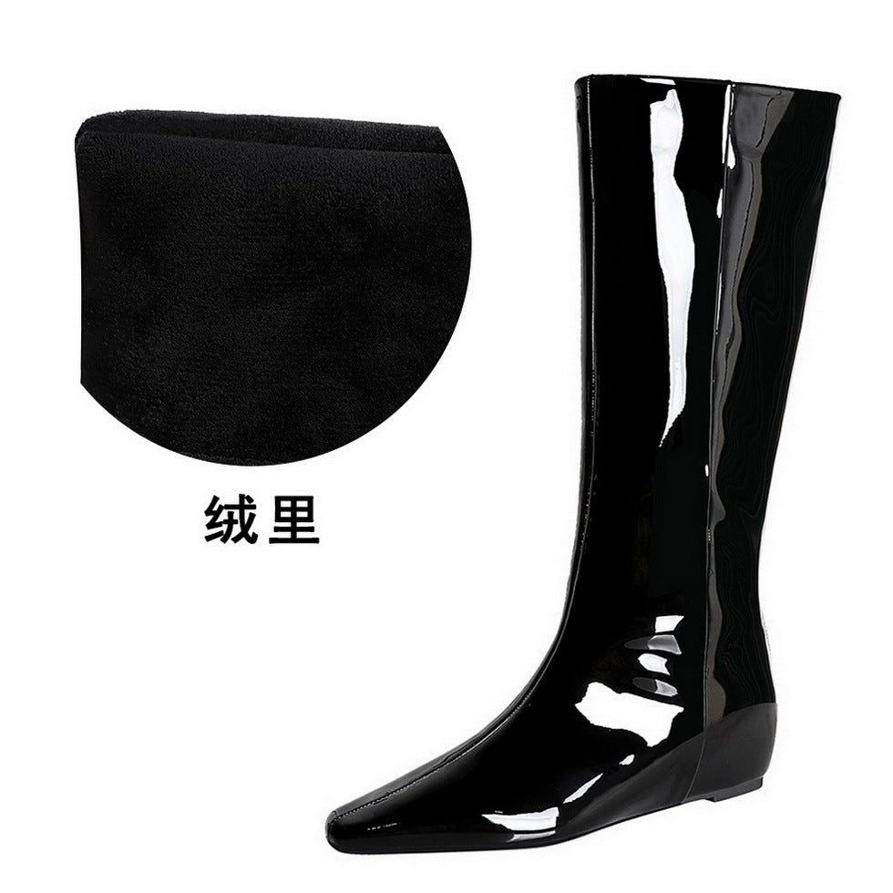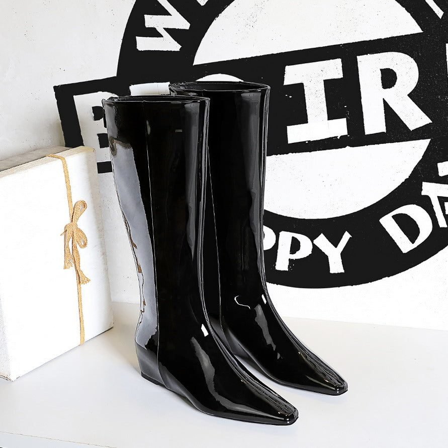 BIGTREE 6632-36 European and American wide-tube women’s boots, rear zipper, small square head, middle heel, and inner heel heightening glossy patent leather high boots