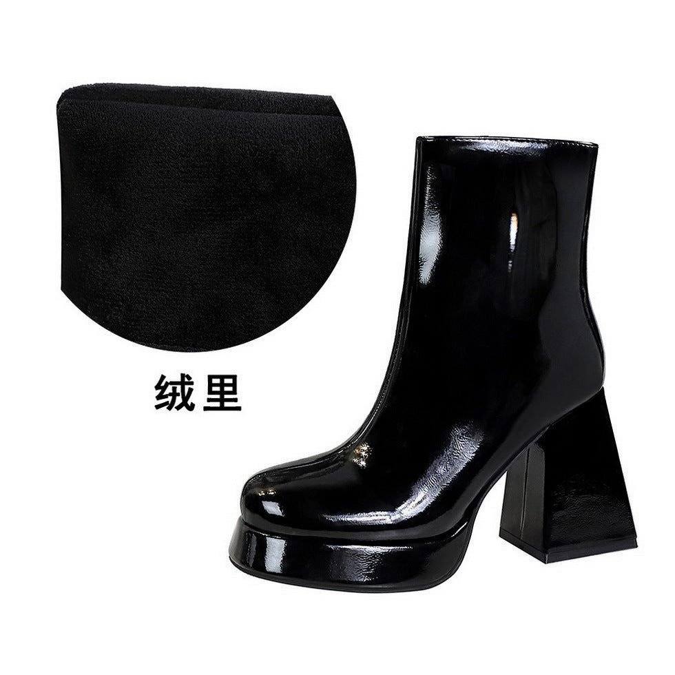 BIGTREE 7992-1 European and American retro women’s boots short thick heel super high heel glossy side zipper round head glossy patent leather short boots