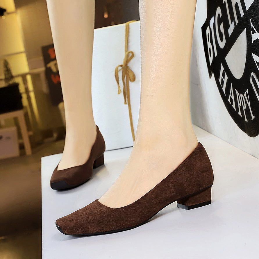 BIGTREE 8291 European and American style temperament square head shallow mouth simple plain surface suede pedicure women’s shoes thick heel low heel professional OL single shoes