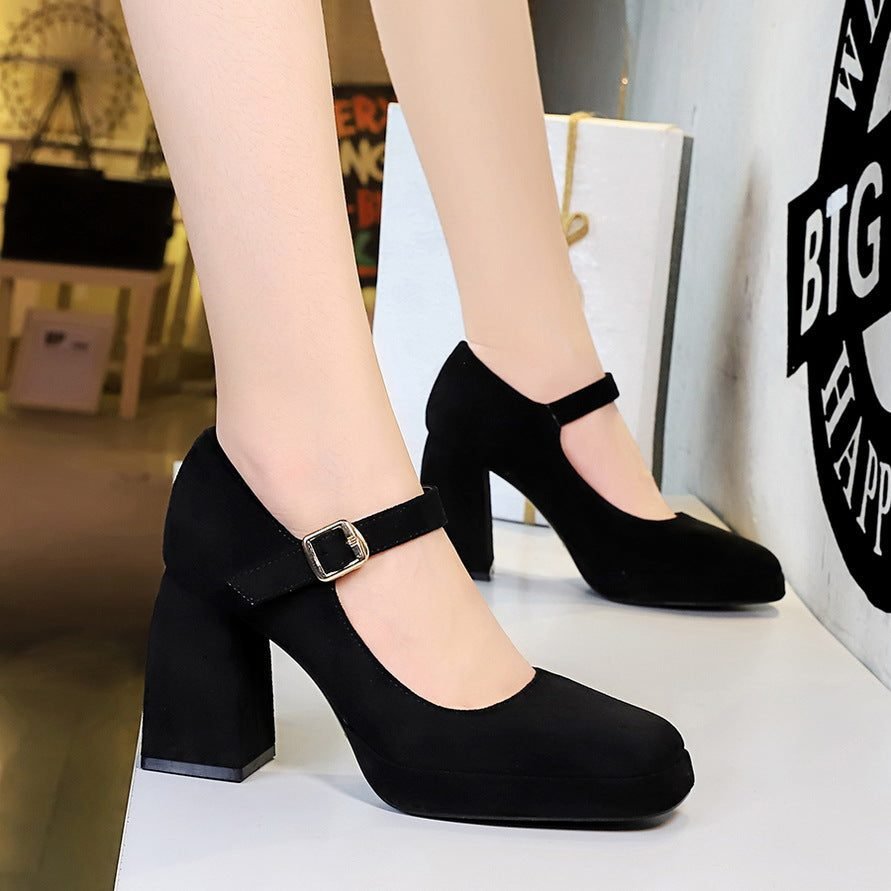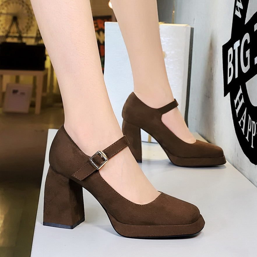 BIGTREE 9613-5 European and American style retro high heels, thick heels, waterproof platform, suede, shallow square scalp, belt buckle, one strap, single shoe woman