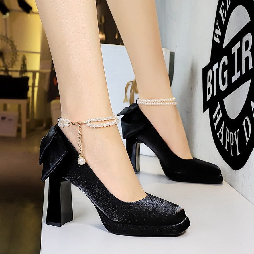 Popular elements: French small fragrance, square head, waterproof table, back bow decoration, pearl chain, one-word single shoes, satin, wedding shoes, super high heel, thick heel.