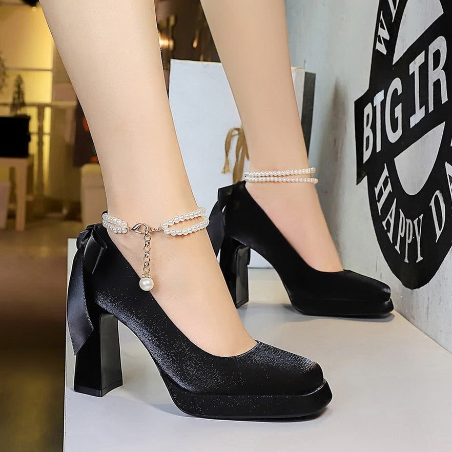 BIGTREE 9982-H79TP Korean version of square head thick heel waterproof table high heels pearl word with back bow satin shoes