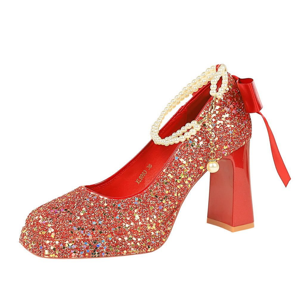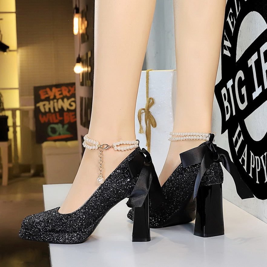 Popular elements:Korean version, back bow decoration, sequins, thick heels, waterproof table, super high heels, single shoes, wedding shoes, pearl chain, pearl strap.
