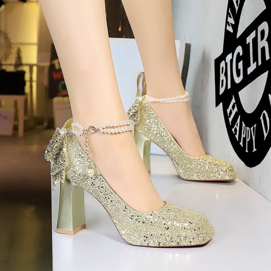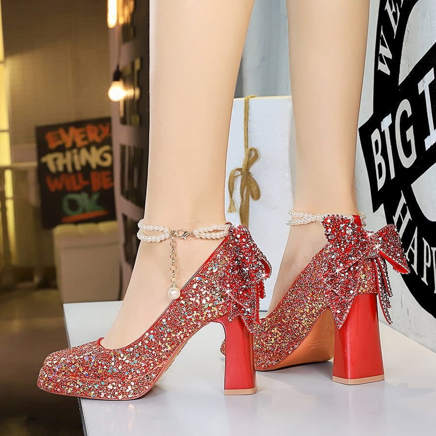 Popular elements: sweet, wedding shoes, pearl chain, one-word strap, high heels, rhinestone bow, rear bow, waterproof table, thick heel, single shoes, shallow mouth, square head.