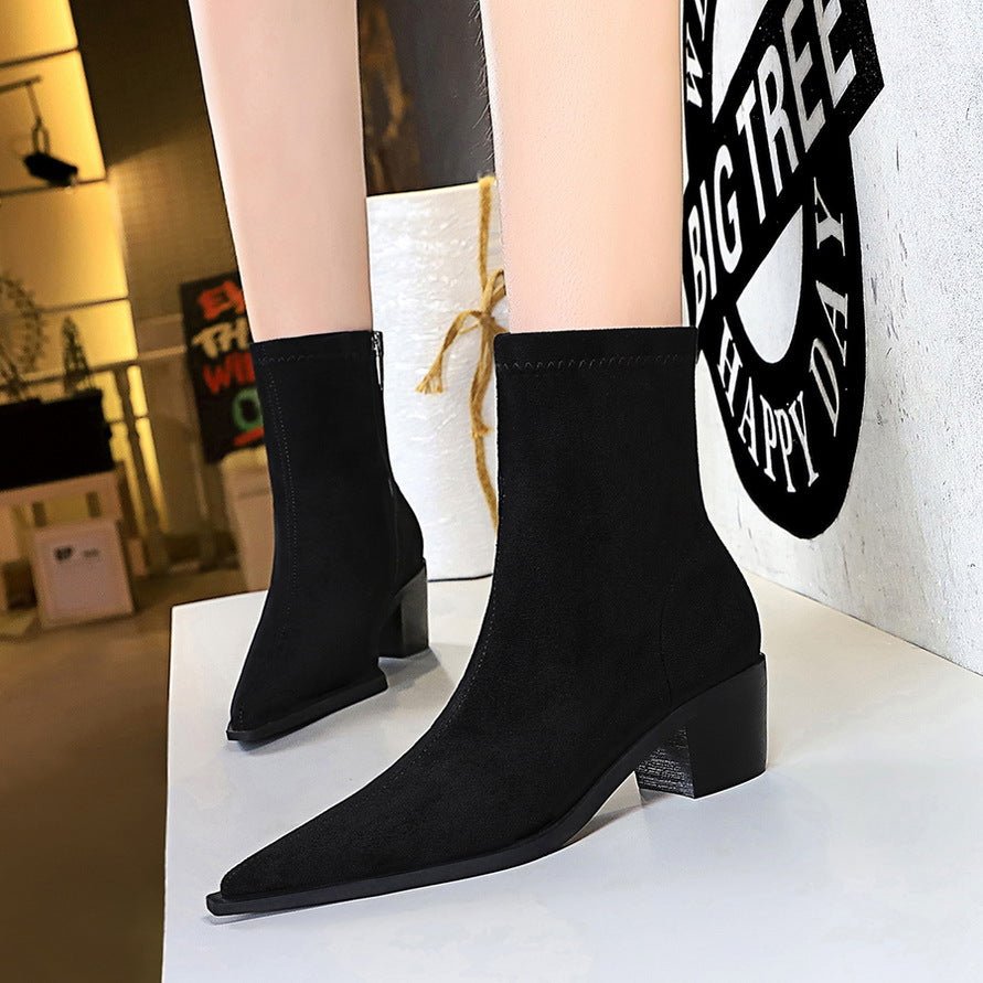 Bigtree Shoes 009-11 European and American Fashion Minimalist Knight Boots Women’s Boots Sexy Nightclubs Thinner Chunky Heel High Heel Pointed Toe Suede Ankle Boots