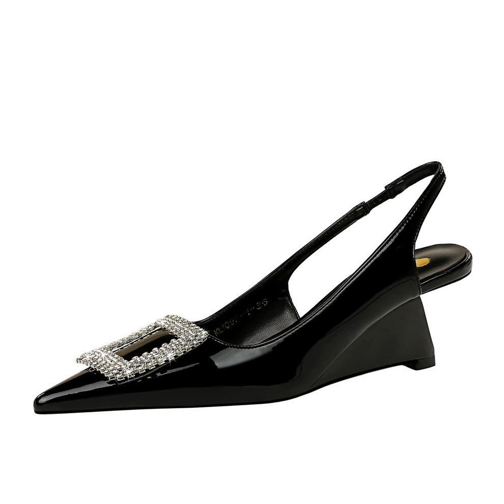 BIGTREE SHOES 1097-k63 Banquet Wedge Women’s Shoes High Heel Low-Cut Pointed-Toe Hollowed Back Strap Metal Square Rhinestone Buckle Pumps