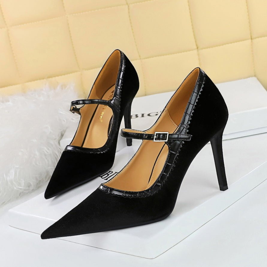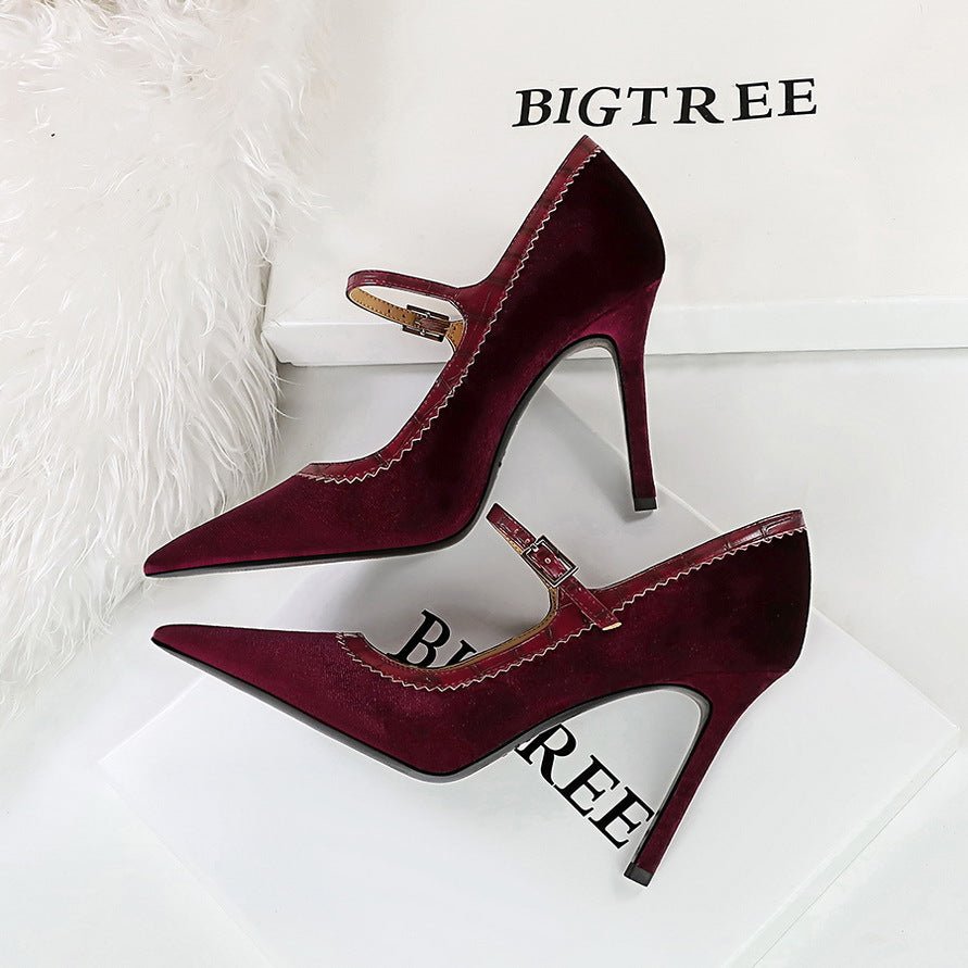 BIGTREE SHOES 1198-7 European and American Style Banquet High Heels Stiletto Heel Shallow Mouth Pointed Toe Thick Suede Strap Women’s Shoes