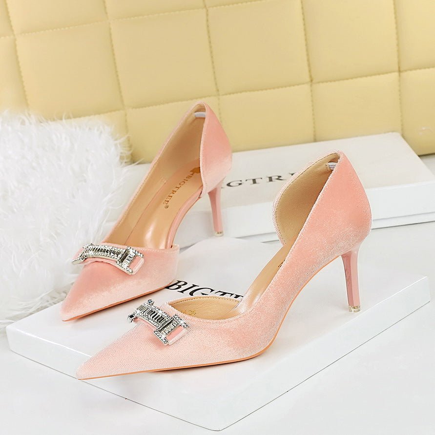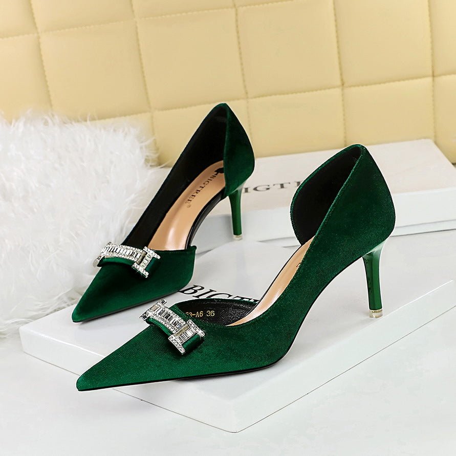 BIGTREE SHOES 1363-Ak80 Banquet High Heels Women’s Shoes Stiletto Suede Shallow Mouth Pointed Side Hollow Metal Rhinestone Buckle Pumps